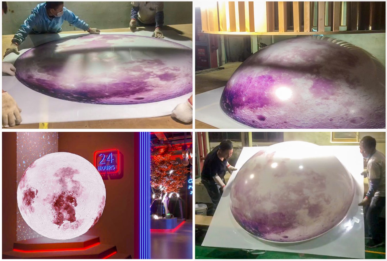 表面處理:根據(jù)月球的要求,進行表面處理,包括噴漆、印刷、覆膜等處理方式,使月球表面更加美觀、逼真。燈箱組裝:將月球燈箱的組成部分,包括吸塑月球、燈箱骨架、燈光、電線等進行組裝,使其達到預(yù)期的效果。
