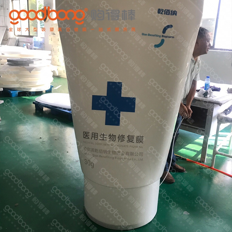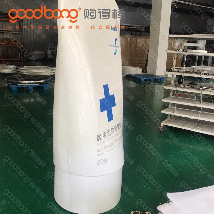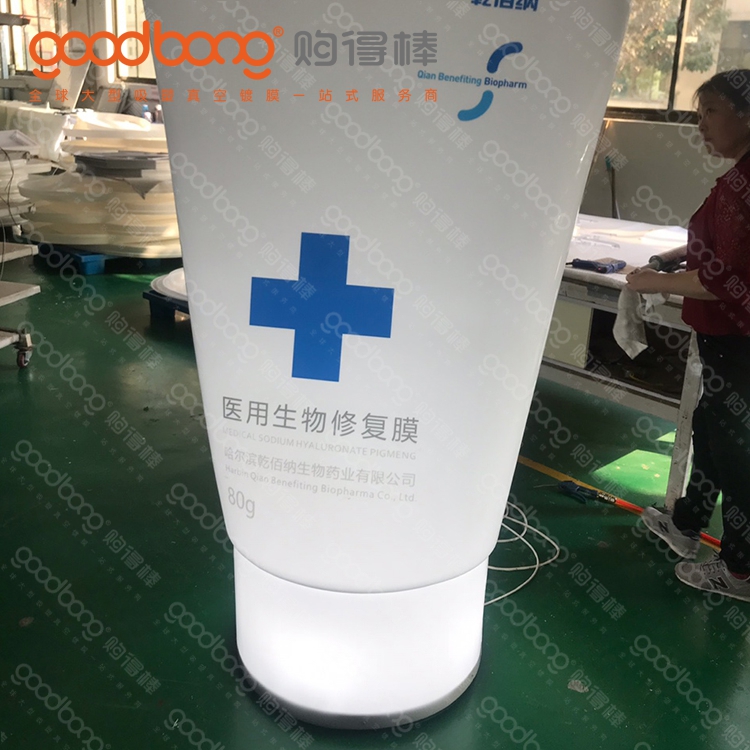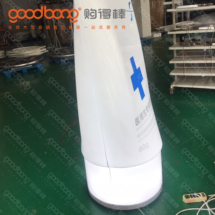 大型吸塑洗面奶瓶子成型后期制作 壓克力吸塑材料基本成型后,還需經(jīng)過(guò)銑邊、鏤銑、打磨,貼膜,美工等好幾道工序,最后將燈箱鋪設(shè)LED節(jié)能光源、烤漆后,一個(gè)三維吸塑燈箱雛形基本完成。